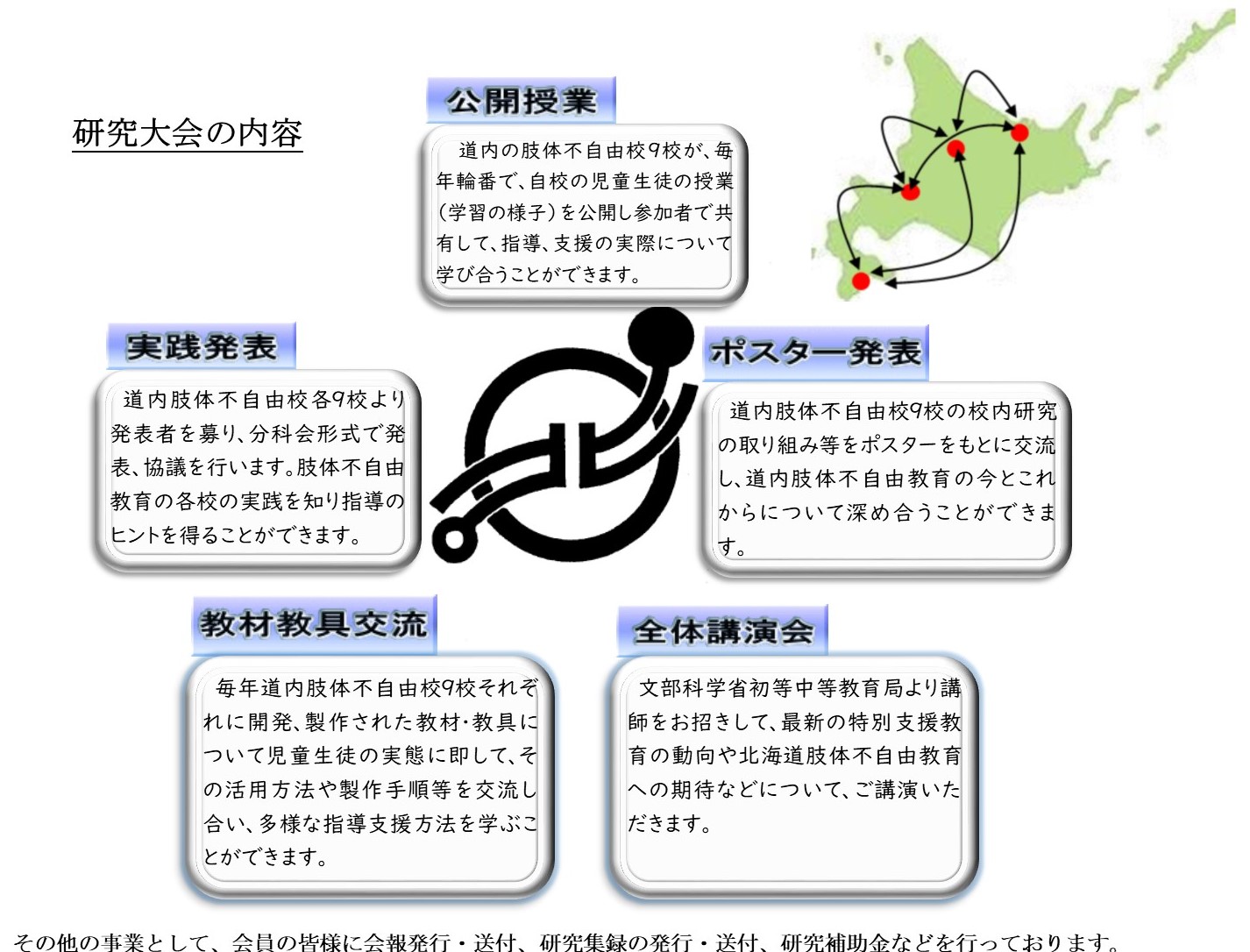 本会は、道内の特別支援学校(肢体不自由)の教職員が中心となり、日常の教育実践のより一層の発展、充実を期して設立、運営されている研究会です。主な事業として、肢体不自由教育の発展と教員の専門性の向上を目指し、研究大会を開催しています。